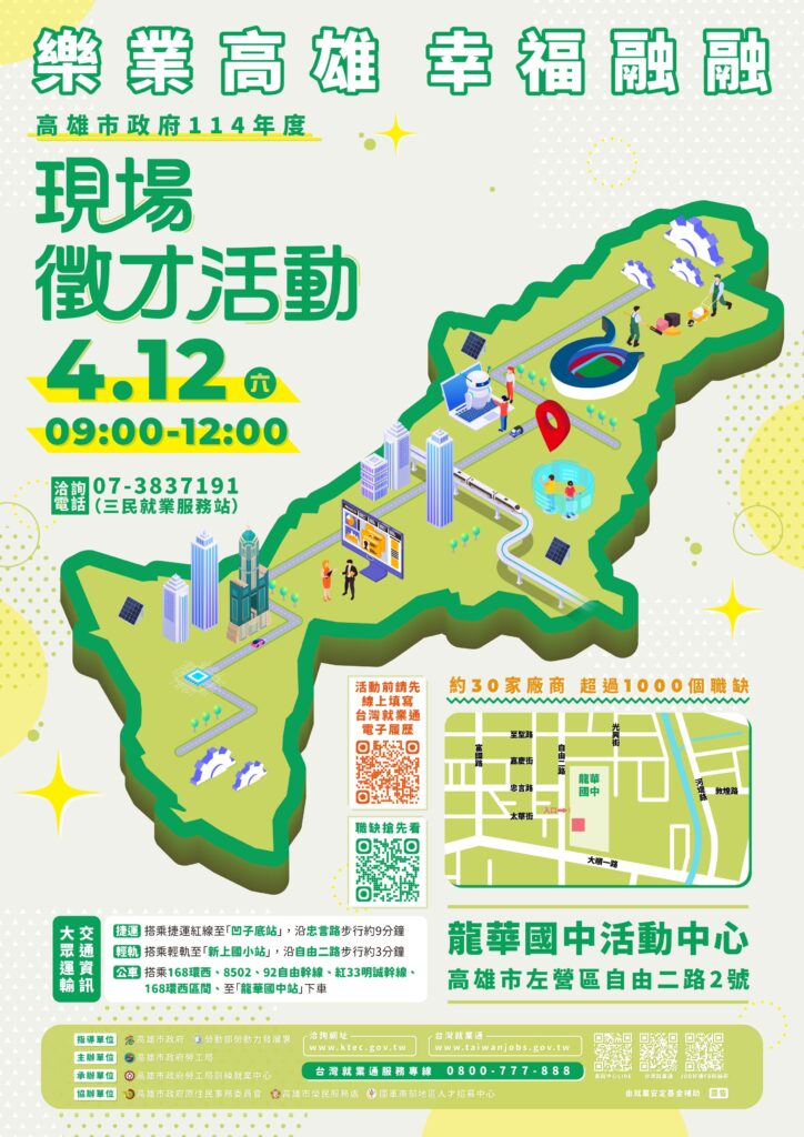 高雄市政府勞工局將於4月12日(六)上午09:00-12:00在龍華國中活動中心(高雄市左營區自由二路2號)舉辦現場徵才活動