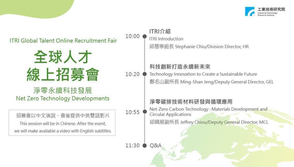 Experts in the field will introduce ITRI’s latest Net Zero technology developments.