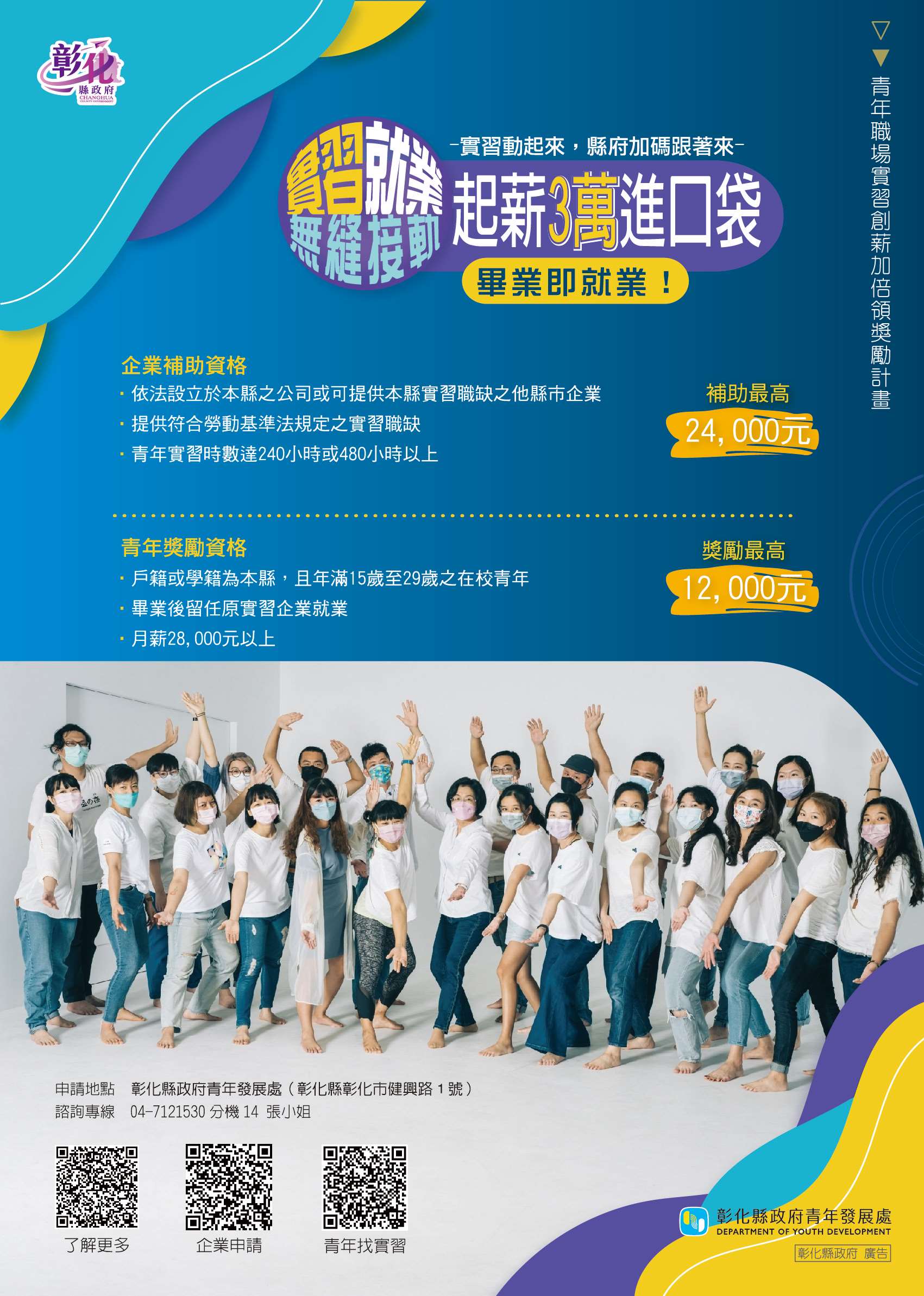 (二)申請資格:青年學生於在校期間透過彰化縣政府「彰青創薪實習站」(https://reurl.cc/qZMGRN)或其他求職平台尋找實習職缺並面試媒合成功後,逕至企業實習,於畢業後繼續留任原實習企業就業,且薪資達新臺幣(以下同)2萬8,000元以上,連續受僱同一雇主滿30日以上,即可檢具申請文件向彰化縣政府申請。