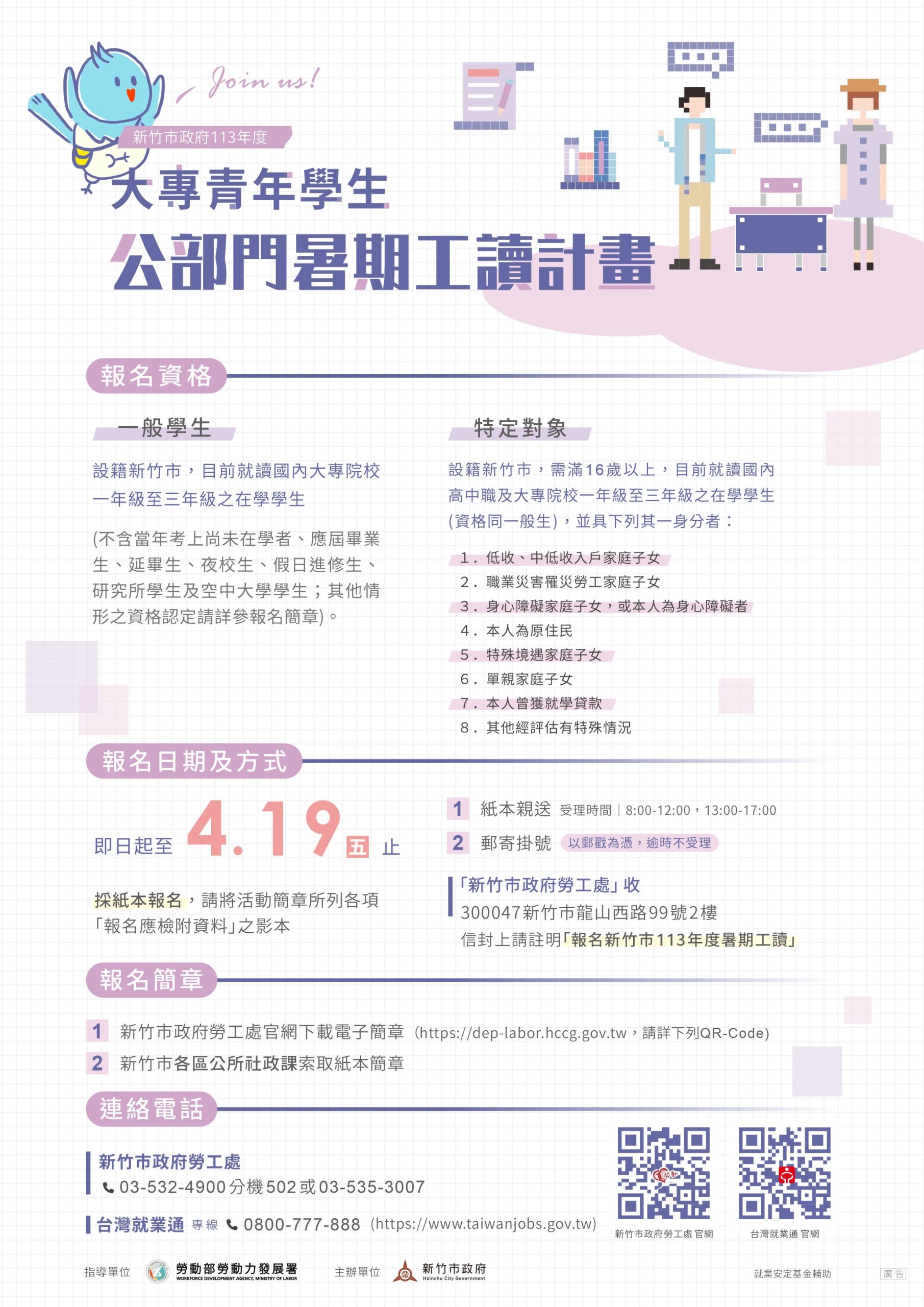(五)報名方式:採紙本報名方式,請將活動簡章所列各項「報名應檢附資料」之影本,親送或郵寄掛號至:新竹市龍山西路99號,新竹市政府勞工處收,信封上請註明「報名新竹市113年度暑期工讀」。
