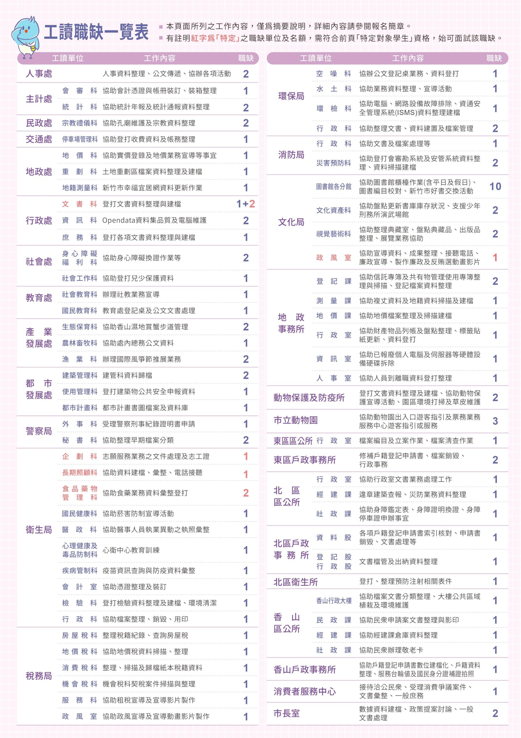 (三)工讀地點:新竹市政府及所屬單位(詳見報名簡章)。