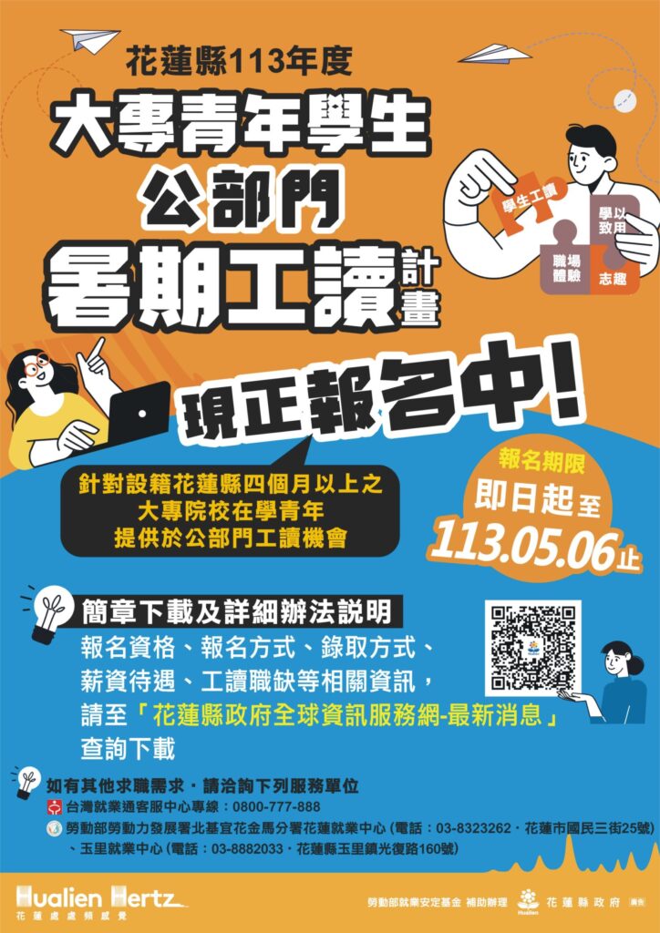 四、本計畫報名資格及注意事項詳參報名簡章、報名表件及工讀職缺,可至花蓮縣全球資訊服務網最新消息(http://www.hl.gov.tw)下載。