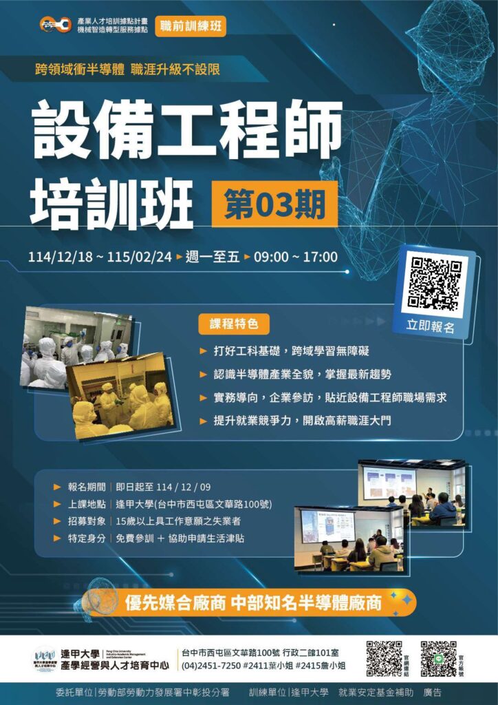 一、逢甲大學已辦理設備工程師培訓班2期,前2期就業率為80%與88%,歡迎想要跨域轉職到科技業、半導體產業、製造業的非理工科系畢業待業者參加。