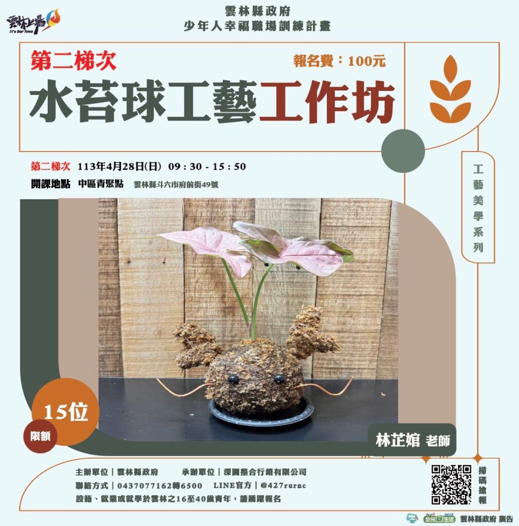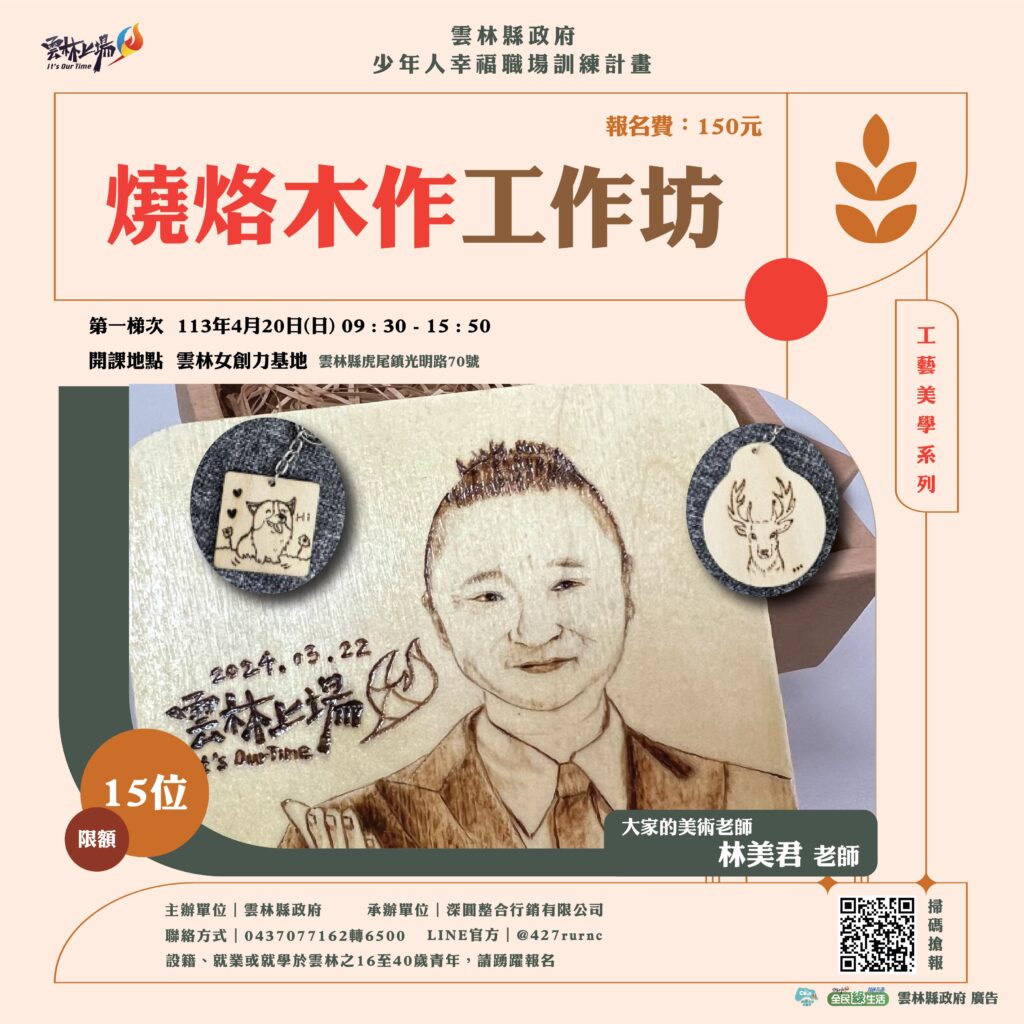 二、承上,青年職人工作坊期待透過實作,提升創新能力、美學能力與工藝創作能力;雲林縣政府現行規劃3項主題工作坊課程資訊如下: