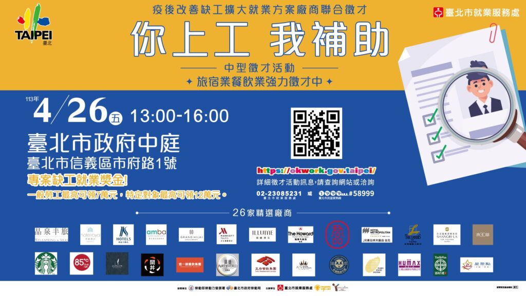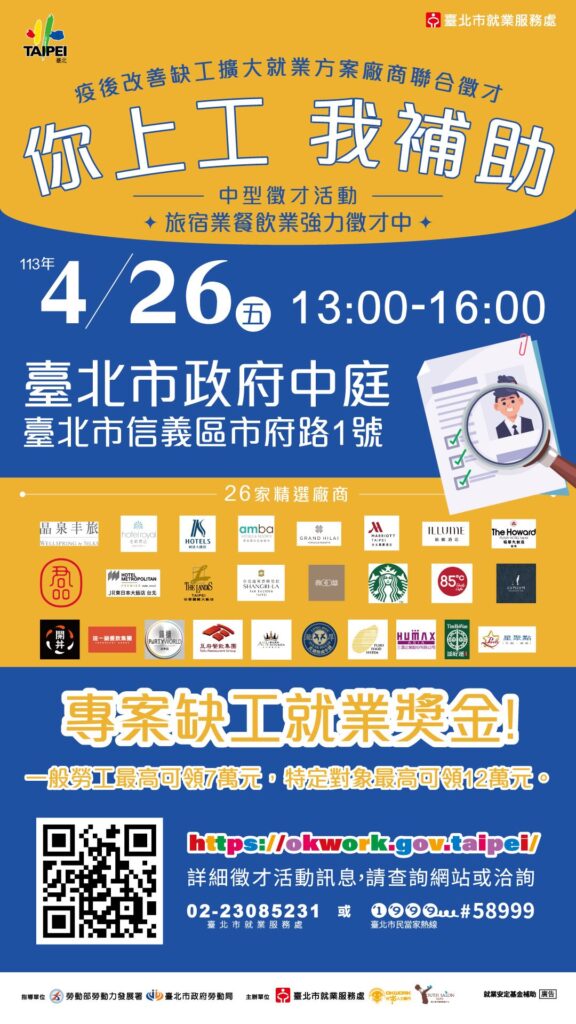 臺北市就業服務處4月26日下午1時至下午4時在臺北市政府1樓中庭(信義區市府路1號)舉辦「你上工我補助」中型徵才,26家優質廠商計1,280個工作機會,詳情資訊可搜尋台北就業大補帖網站或電洽02-23085231。