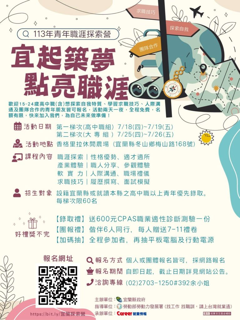 一、宜蘭縣政府為促進青年提前做好職涯探索,減少未來升學或就業摸索期,特辦理兩天一夜的「113年度青年職涯探索營」,從職涯探索與職涯規劃、在地創生產業介紹及場域參訪、職場禮儀、撰寫履歷及面試技巧、人際溝通及表達能力、、團隊動力課程等多元面向課程,協助青年職涯啟蒙、職涯建立、職涯定錨及發展,讓青年彼此藉由同儕交流互動激盪,期以提升自信及能力,進而達到順利就業之目的。