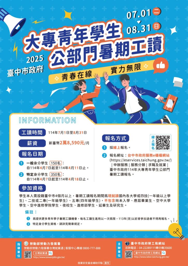 (三)報名簡章及詳細內容已於114年3月24日公告於臺中市政府勞工局官網(首頁/勞工服務/就、創業與訓練/大專青年學生公部門暑期工讀)